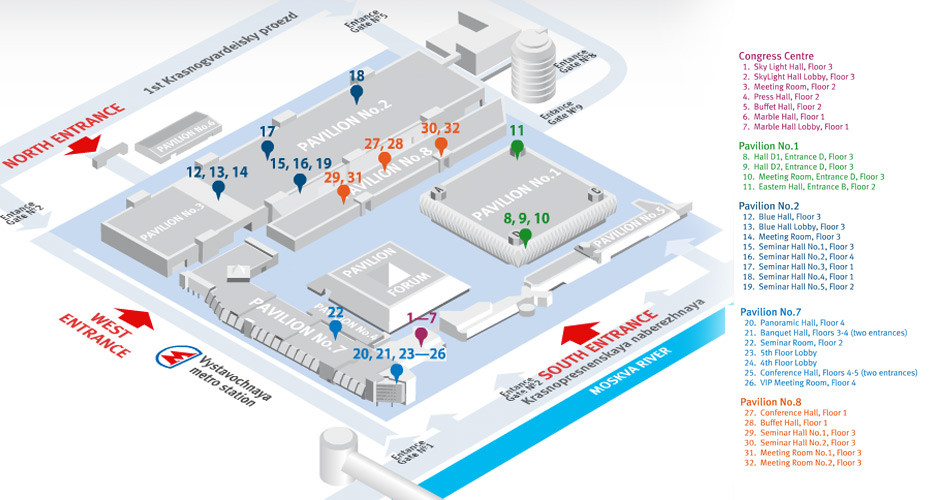 俄罗斯莫斯科中央展览中心 Expocentre Fairgrounds有三个入口:北部,南部和西部。这就是为什么它可以从Krasnopresnenskaya naberezhnaya(堤坝),第一个Krasnogvardeyskiy proezd和直接从Vystavochnaya和Delovoy Tsentr地铁站到达。